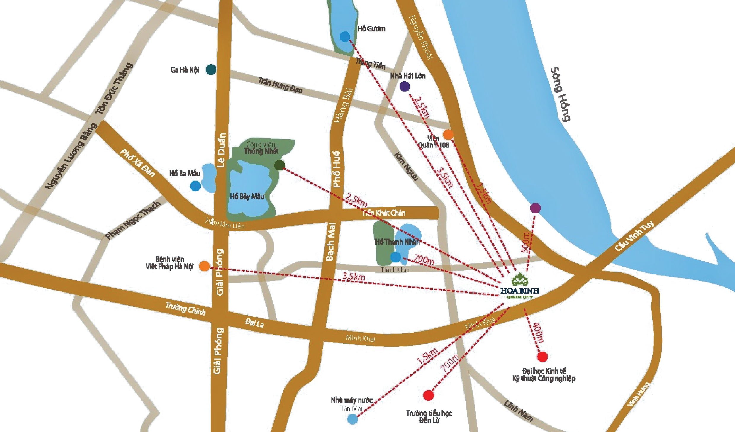 - Hòa Bình Green City là dự án trọng điểm thuộc phía Đông Nam thành phố. Dự án nằm ngay tại chân cầu Vĩnh Tuy – tuyến đường huyết mạch vào trung tâm thành phố. Dự án được xây dựng với nhiều đặc điểm “độc nhất vô nhị” tại Hà Nội.