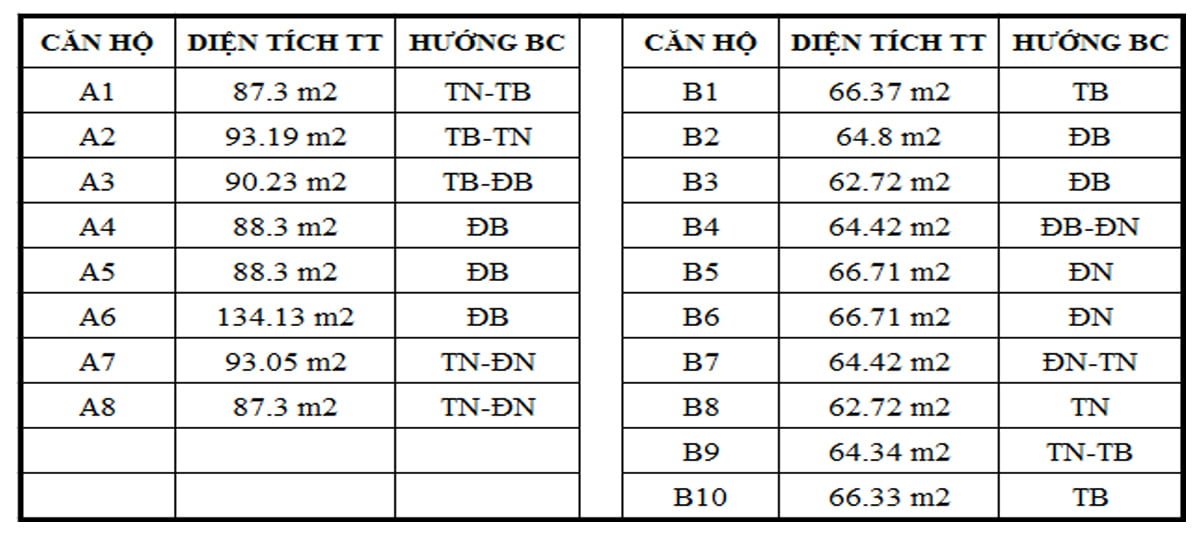 * Toàn bộ tòa B: Diện tích căn hộ 2 phòng ngủ: 62m, 64m, 66m
